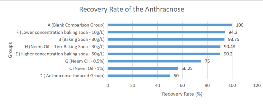 Group C (Neem Oil – 1%) exhibited a recovery rate of 56.25%, indicating a moderate efficacy in anthracnose control. Group G (Neem Oil – 0.5%) showed a recovery rate of 75.00%, suggesting higher efficacy compared to neem oil alone. Group H (Neem Oil + Baking Soda) displayed a recovery rate of 90.48%.