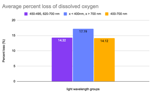 Figure 3. A comparative graph which shows the average percent loss of dissolved oxygen across all there trials. The mean was taken from the three groups of each wavelength.