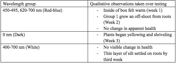Changes to the setup must be made in future studies in order to take proper measurements. From this experiment it is hard to say what the proper size of container would be. In order to prevent extensive respiration in future research, testing can be done on the ideal container size to determine whether the plants would benefit from a full-size tank or if a 250 mL beaker would suffice. Warmth is something that can be moderated by a professional growth chamber but in a replica of this experiment it would be easier to reduce the number of LEDs/ft2 or increase the distance to the lights. Further research may also include experimentation to determine the amount of gaseous oxygen produced. This experiment would require a solute to be dissolved in the water to prevent the oxygen from dissolving and an air-tight pressure system would need to be established. While measuring changes in oxygen it may be beneficial to measure the net change over a long period of time as there may be a positive shift after two weeks that wasn’t visible at the one-week mark. There could also be research done on splitting wavelengths even further to have experimental groups of 620-700 nm (red) and 425-495 nm (blue) light separately. In order to develop a system fit for space there must also be data collected on the effects of microgravity on aquatic plants.