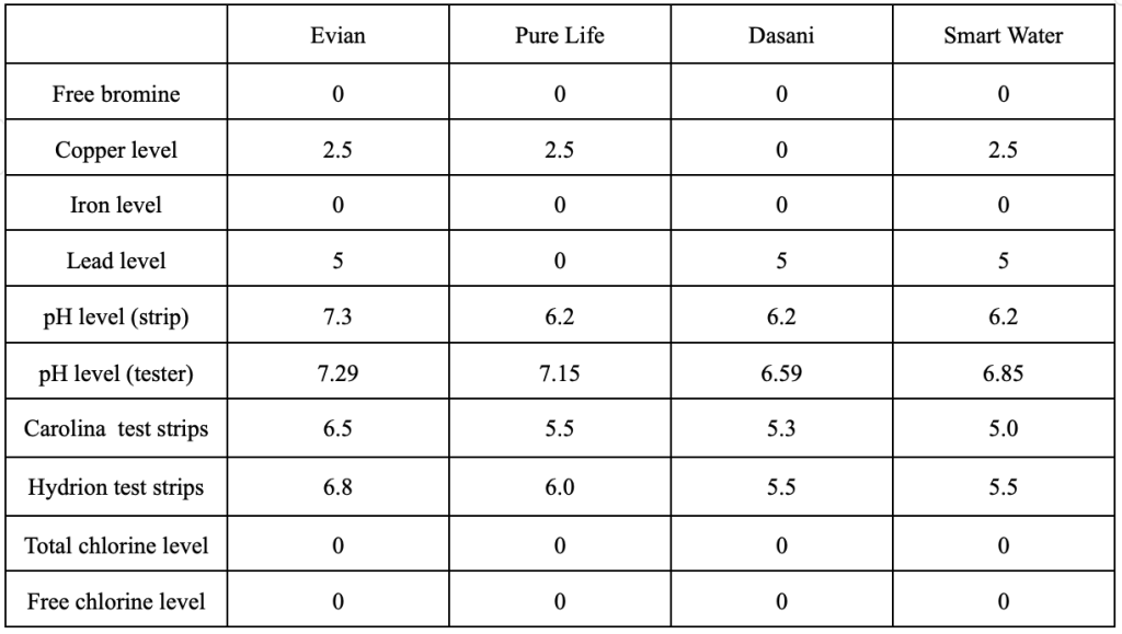 See Table 1 for the average results of the three tests conducted per the method for each of the bottled waters. Smart Water stayed consistently at a level of 2.5 mg/L for the level of copper in the water, while the others samples averaged 0 mg/L .The level of pH in Evian water and Pure Life water stayed consistent, they were mostly neutral (7.0-7.5) or slightly acidic (6.5-6.9). The pH levels in Dasani water and Smart Water had a few results of very acidic water (5.0).