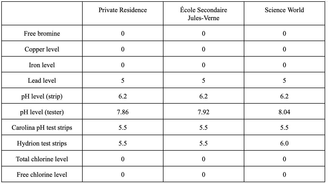 Since the bottled water samples, the water collected from the private residence and École Secondaire Jules-Verne were not tested within the 2-hour window, there is a possibility that the pH changed to a more neutral result throughout the day and lead to inaccurate results.