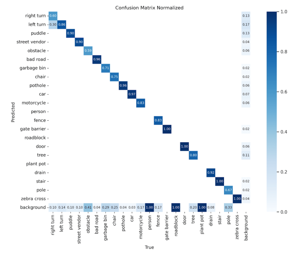 - Recall showcases the model’s ability to detect all relevant objects. High recall can be essential in ensuring no obstacles are missed.