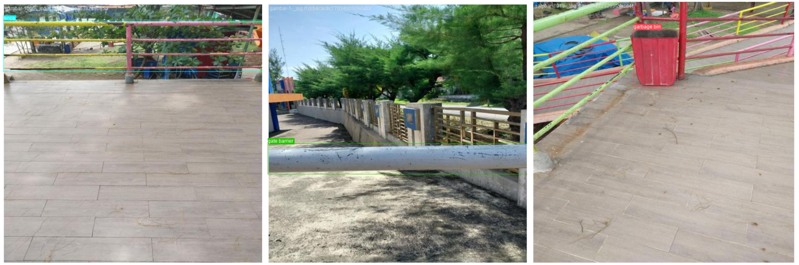 The “Obstacles in Public Spaces for Dist-YOLO” dataset by Mufti Restu Mahesa (Mufti Restu Mahesa, 2024) was used. The dataset contains a curated collection of 3350 images capturing obstacles in public environments. There are a total of 22 obstacle classes: Right Turn, Left Turn, Puddle, Street Vendor, Obstacle, Bad Road, Garbage Bin, Chair, Pothole, Car, Motorcycle, Pedestrian, Fence, Gate barrier, Roadblock, Door, Tree, Plant pot, Drain, Stair, Pole, and Zebra Cross. Each image was annotated with bounding boxes indicating the location and class of obstacles (Figure 1). For the purpose of this study, the database was randomly split into 80% training, 10% validation, and 10% testing sets. A custom YAML configuration file was generated to define the dataset structure and class labels to guide model training.