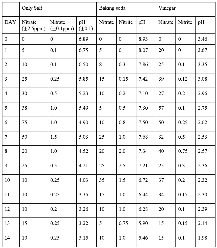As seen on Figure 7, the pH for the NaCl group started at 6.89 and steadily declined to 3.15 by Day 14, suggesting a gradual acidification. Nitrate levels increased rapidly from 0 ppm at Day 0 to a maximum of 75 ppm on Day 6 before decreasing, while nitrite levels peaked at 1.5 ppm on Day 7.