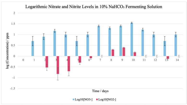 Figure 2: Graph comparing varying [NO3–] and [NO2–] in 10% NaHCO3 throughout the fermentation period