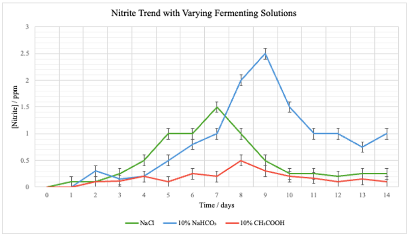 However, this study is limited by the small sample size, with only three replicates per condition and three stages of variance, which restricts the statistical power of the findings. Additionally, utilizing test strips for nitrate and nitrite measurement introduces inherent uncertainties, as the colours on the strips are interpreted by the human eyes, which limits the precision of the data. Temperature fluctuation such as room drafts or nearby heat sources, may have been present during the fermentation stages, potentially affecting microbial activity. To address these limitations, future studies should include a larger number of replicates, employ more precise analytical methods, such as spectrophotometric assays, and ensure stricter environmental control, such as storing the fermenting vegetables in a closed system or space, to reduce variability.