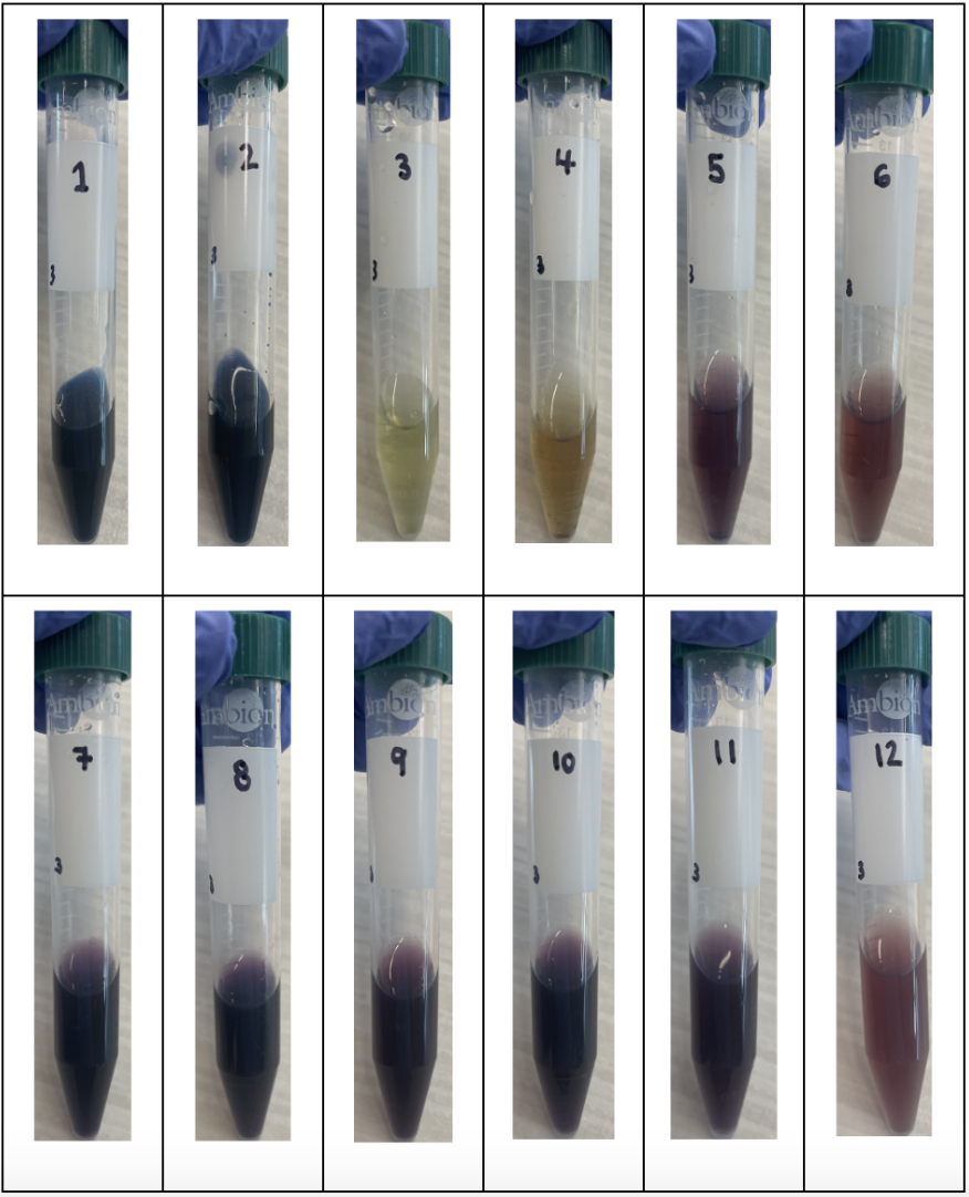Overall, the experiment yielded relatively consistent results that suggest that the polyphenolic extract is able to inhibit the enzyme, amylase, from breaking down the starch. Nearly all vials containing different amounts of polyphenols remained a deep indigo upon the addition of iodine indicator, indicating the presence of starch even after the addition of amylase. Some of the vials that did not remain blue can be attributed to a source of error as the duplicate vials did not yield the same result. A source of error may be the size of the iodine drops as only a few were added, but the size of each drop slightly varied. Since control vials 3 and 4 demonstrated that the amylase did, in fact, break down starch, it can be concluded that the addition of the polyphenol extract caused the enzyme function to be inhibited. However, there were some inconsistencies in results such as the difference between duplicate vials. Since there was no significant colour difference between the vials containing different amounts of polyphenol, there is not a clear conclusion about how the volume of polyphenol extract affects the enzyme inhibition. This may be due to slight differences in the amount of iodine added as more iodine seems to yield a more vibrant colour, as seen in Figure 2 – vials 11 and 12, (although the measurements were made as precisely as possible) or the amount of time in between the addition of certain solutions.