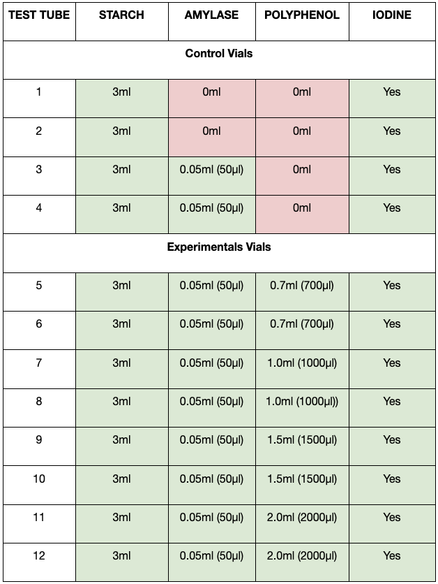 To 20ml of distilled water, 1.5g of amylase enzyme powder (LD Carlson) was dissolved to form an amylase enzyme solution. To test the enzyme inhibiting function of the polyphenol, twelve 14ml plastic vials (Ambion) were labelled from 1-12 and 3mL of the starch solution was added to each vial using a 3mL transfer pipette.Vials 1-4 served as controls where vials 1-2 contained only starch and vials 3-4 contained starch and 50μl amylase enzyme solution. Vials 3-4 were observed as a control to ensure that the amylase did, in fact, break down the starch. The remaining test tubes contained 700μl, 1000μl, 1500μl or 2000μl of the polyphenol extract using a micropipette with duplicates of each (Table 1). Two drops of iodine reagent (ALDON) were added to all test tubes (vials 1-12) after 35 minutes. The colour of the solution upon addition of the iodine indicated the presence of starch. A dark blue or indigo would indicate presence of starch while a clear, pale yellow would indicate an absence of starch. The experiment was replicated for a total of three trials.